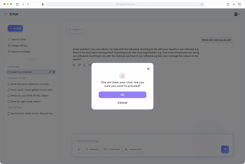 Users can easily manage their past chats by renaming or deleting them directly from the sidebar. When clicking Delete, a confirmation popup appears to prevent accidental deletions, ensuring a smooth and safe user experience.