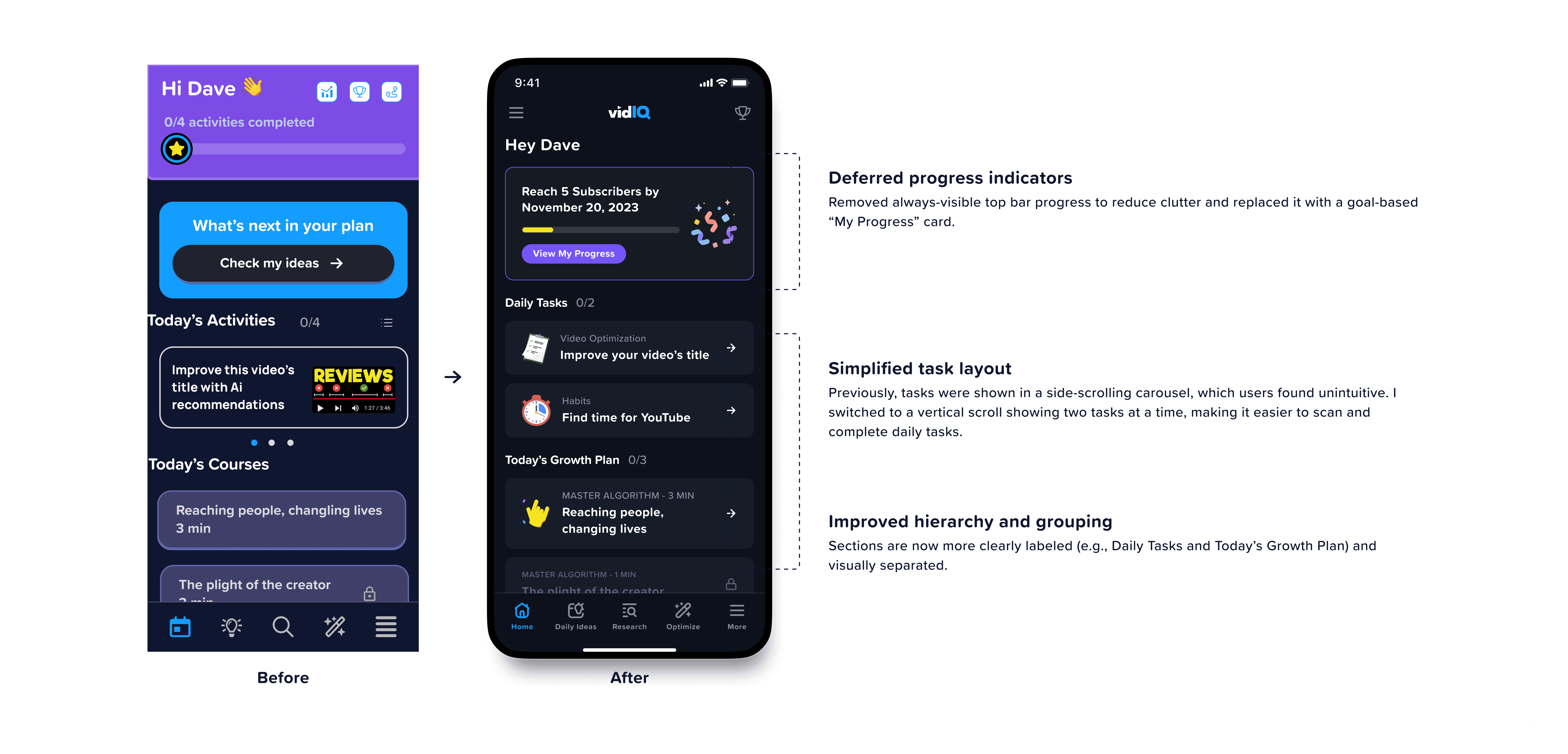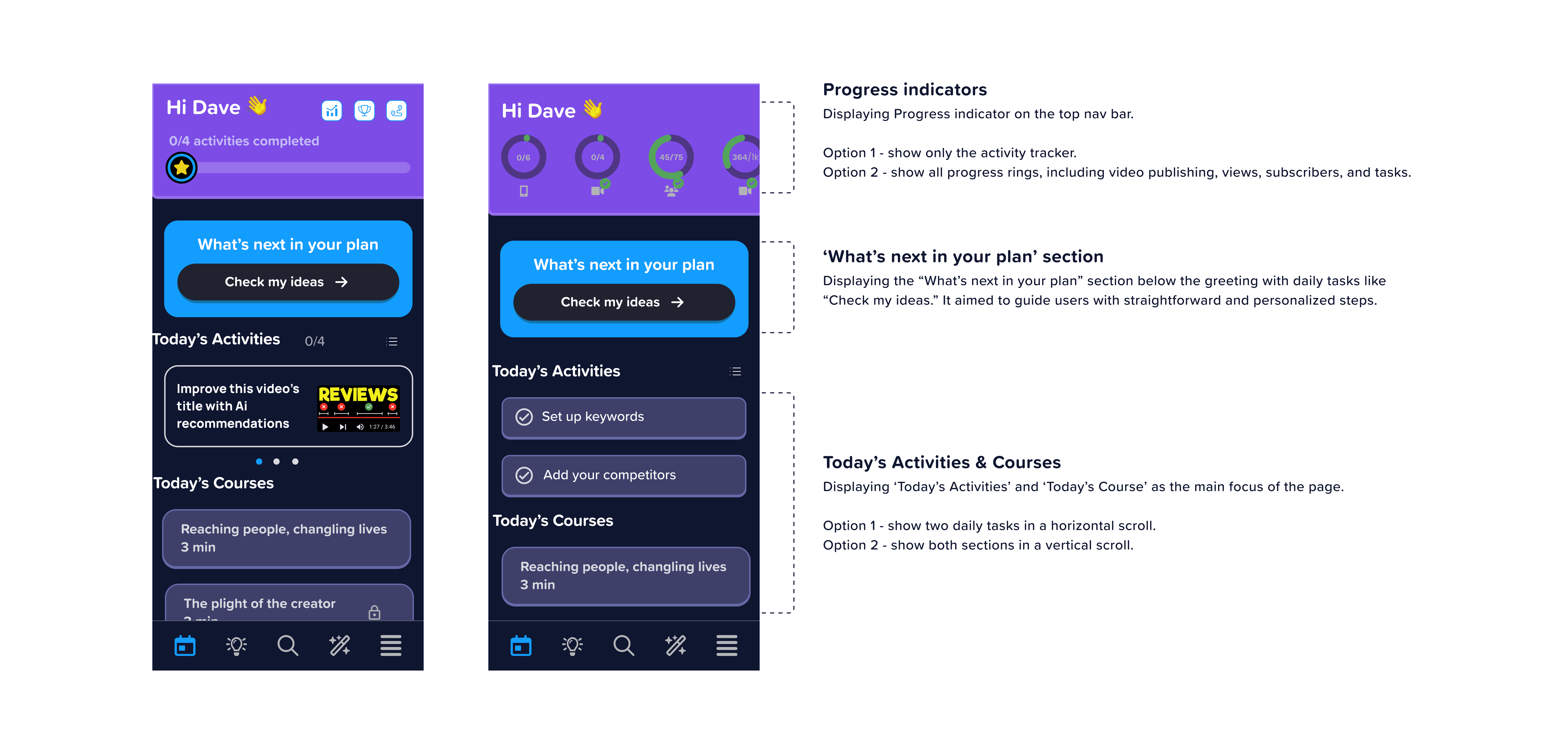 → Progress feedback was simplified and surfaced contextually, allowing users to focus on tasks rather than constantly interpreting metrics.The “What’s next in your plan” section was frequently skipped, as it visually resembled a banner. The label “Check my ideas” felt vague and disconnected from users’ actual progress or next actions.