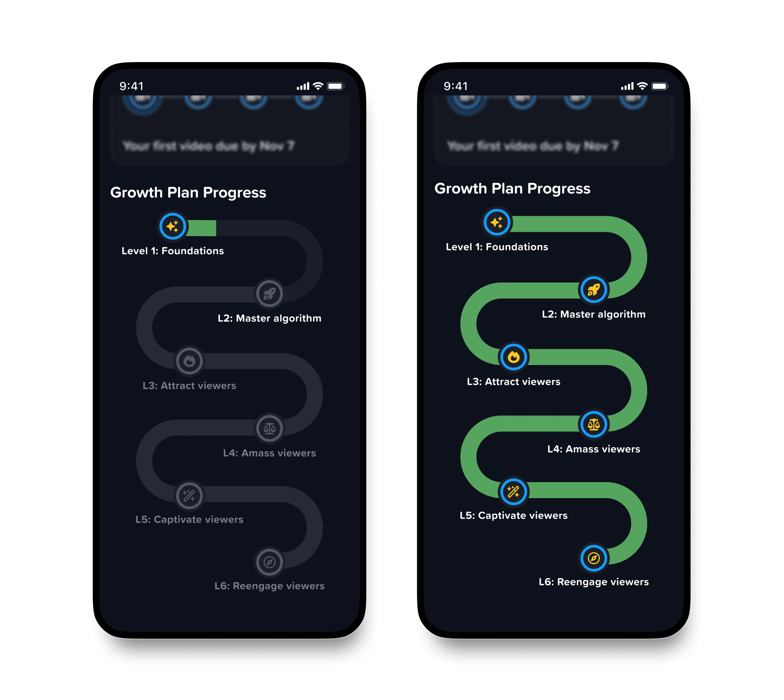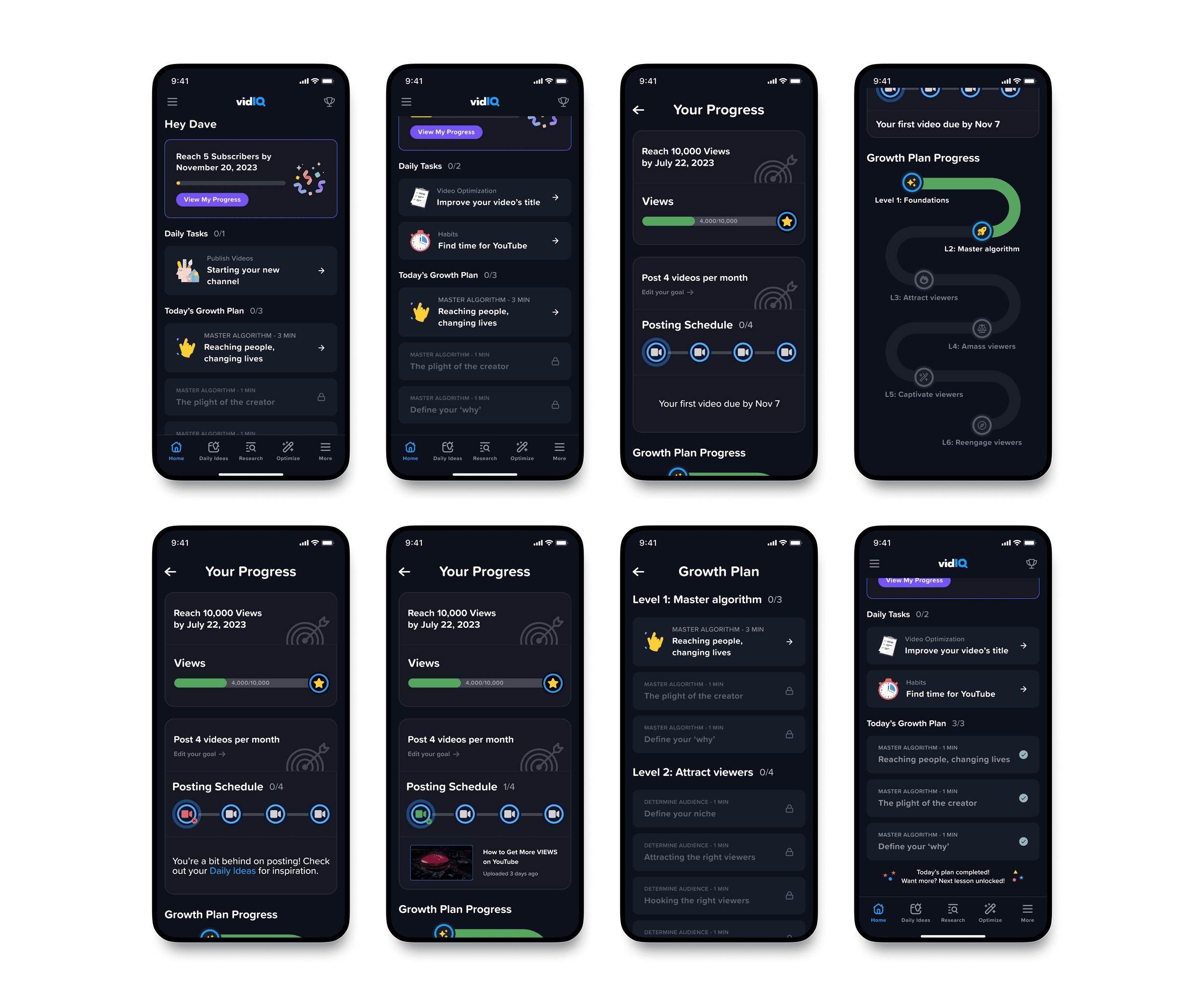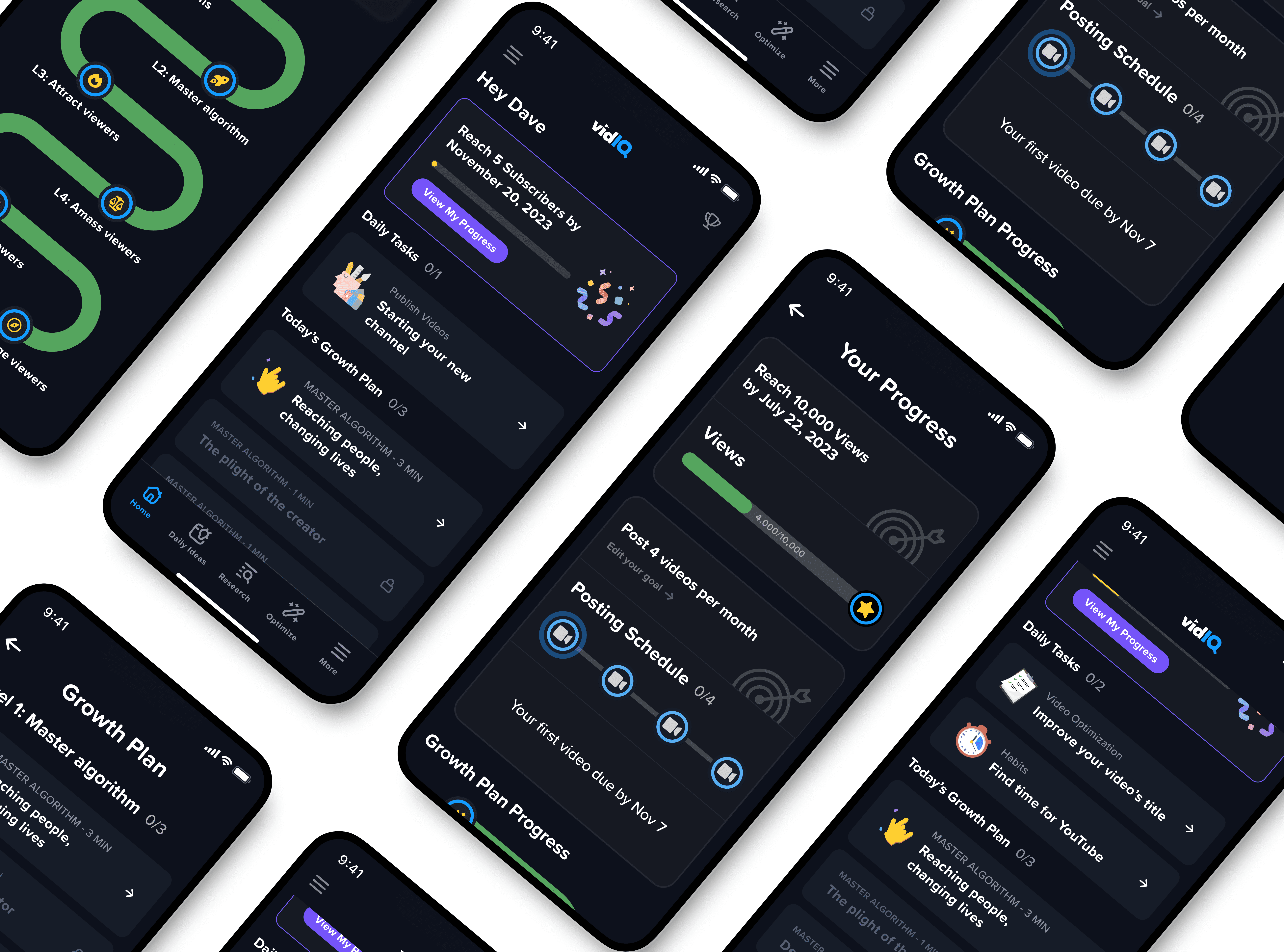 vidIQ is a mobile app that helps YouTube creators grow smarter and faster. I designed the coach approach dashboard and the growth plan progress.