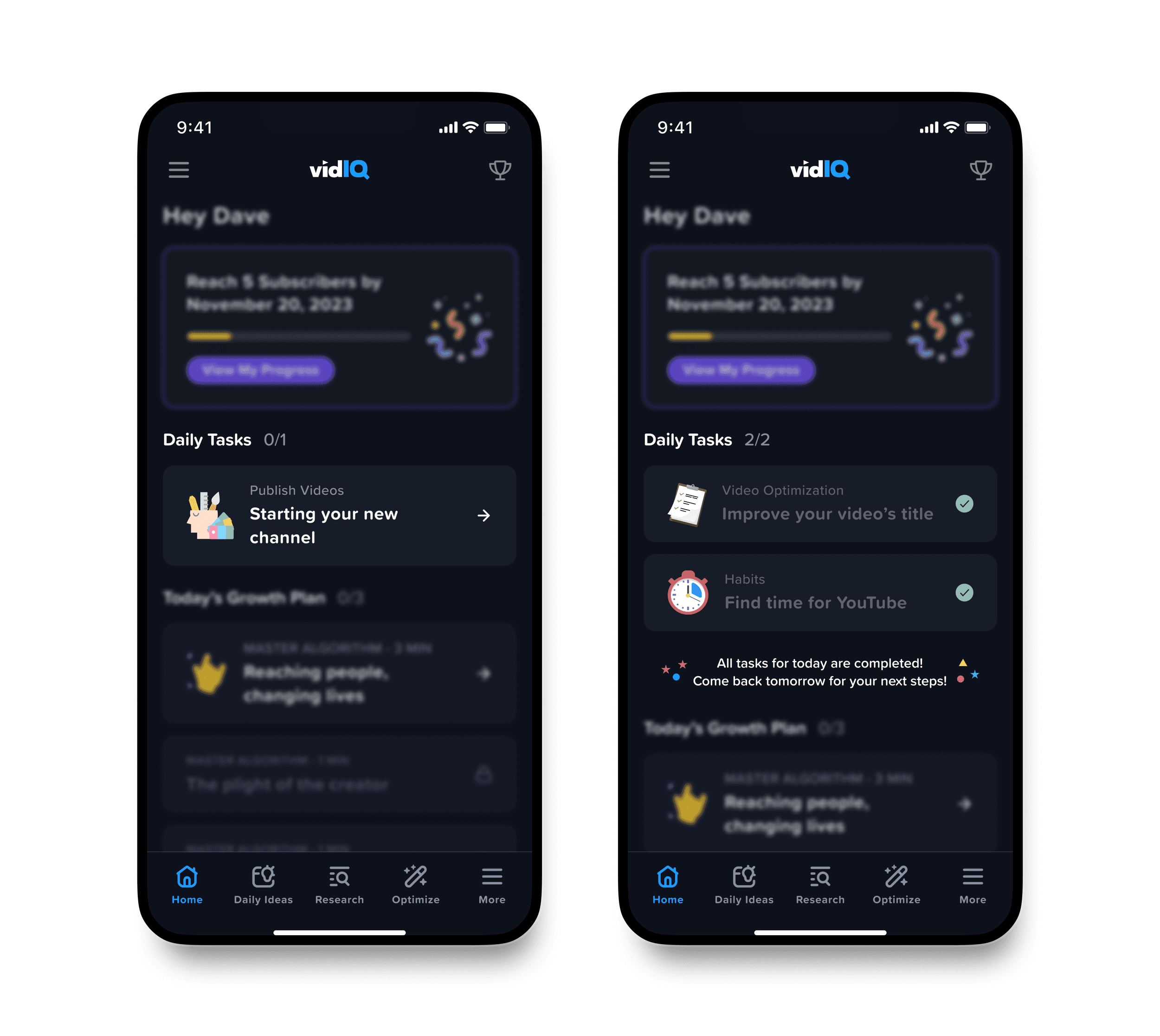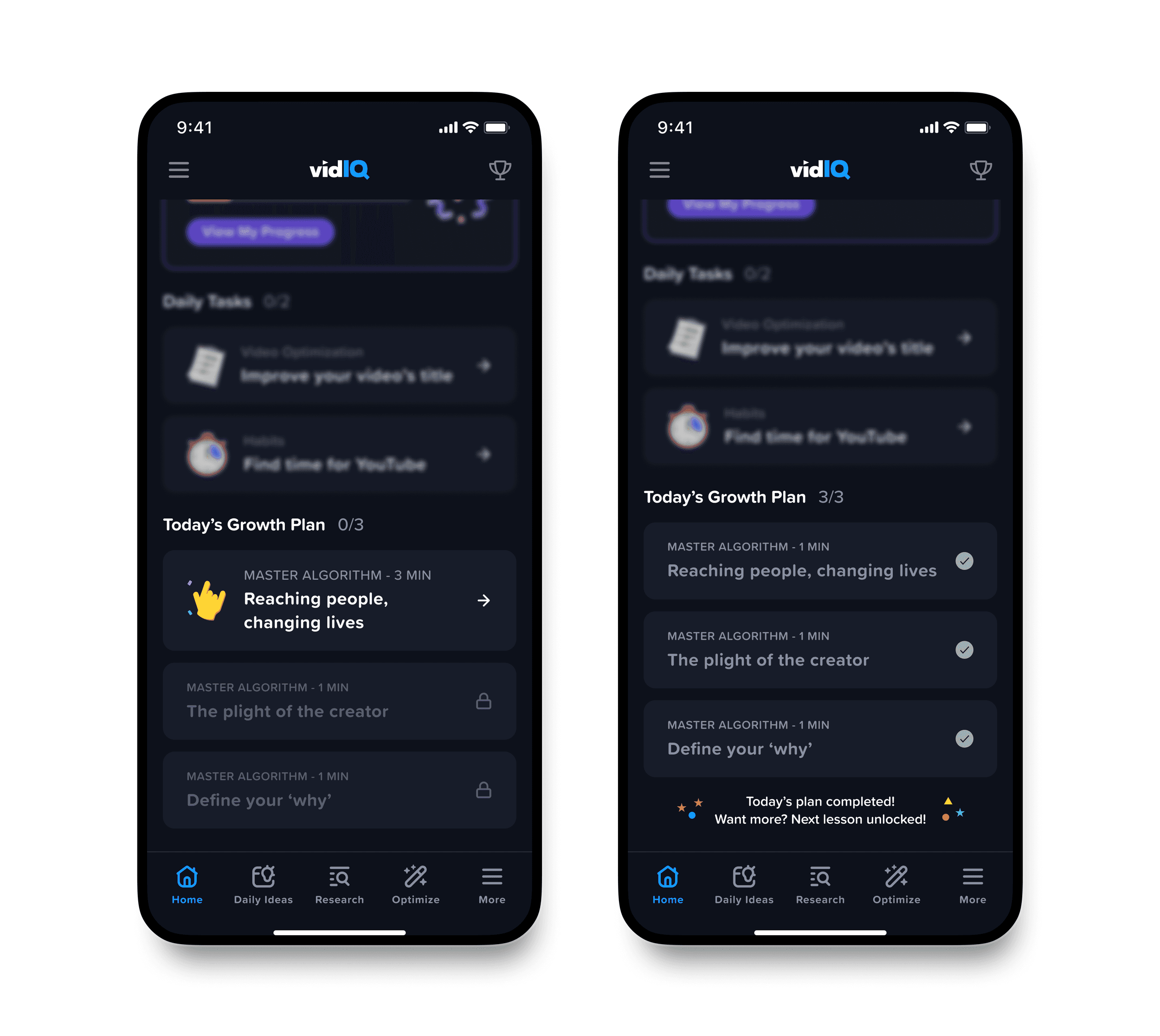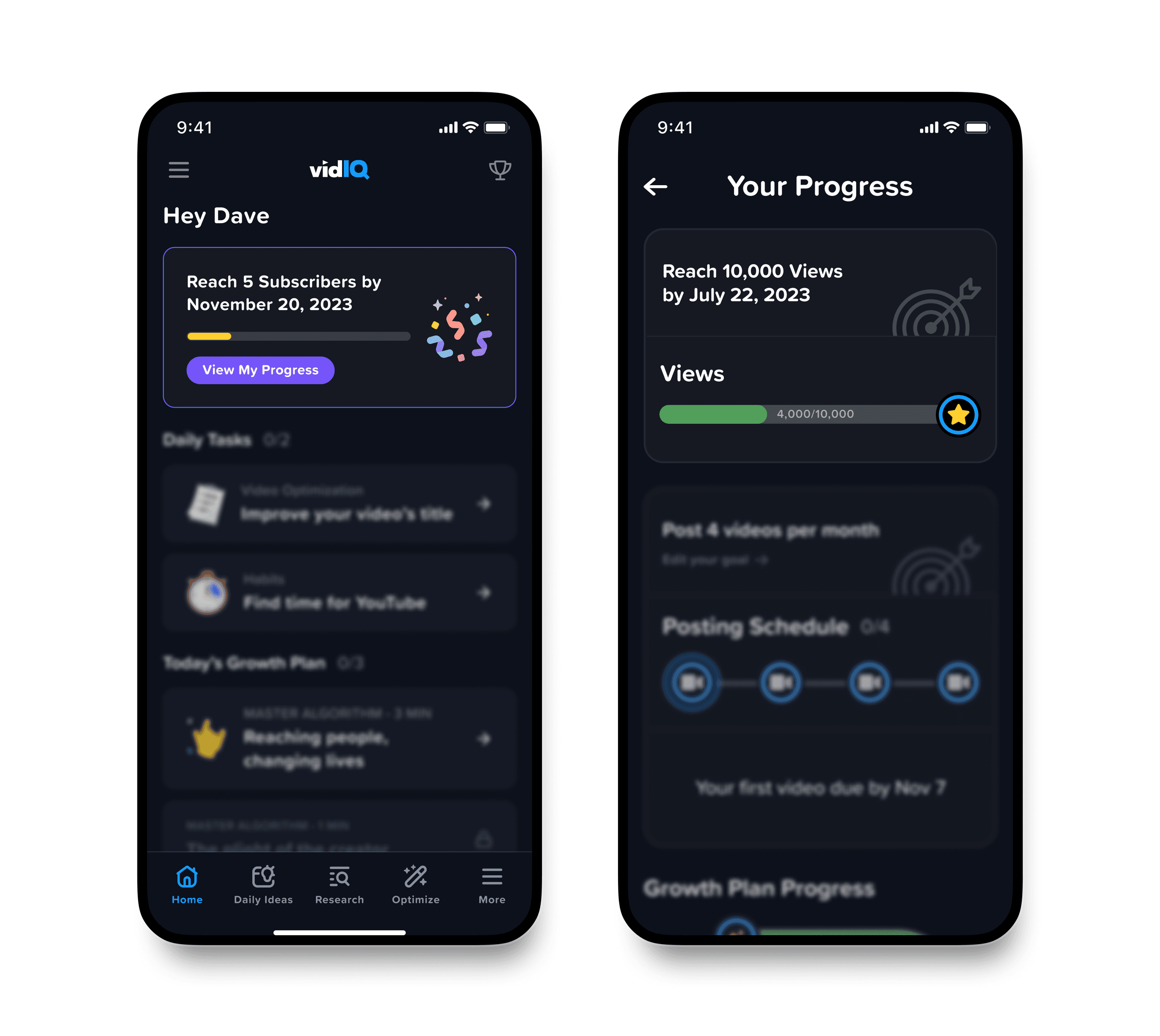 vidIQ is a mobile app that helps YouTube creators grow smarter and faster. I designed the coach approach dashboard and the growth plan progress.