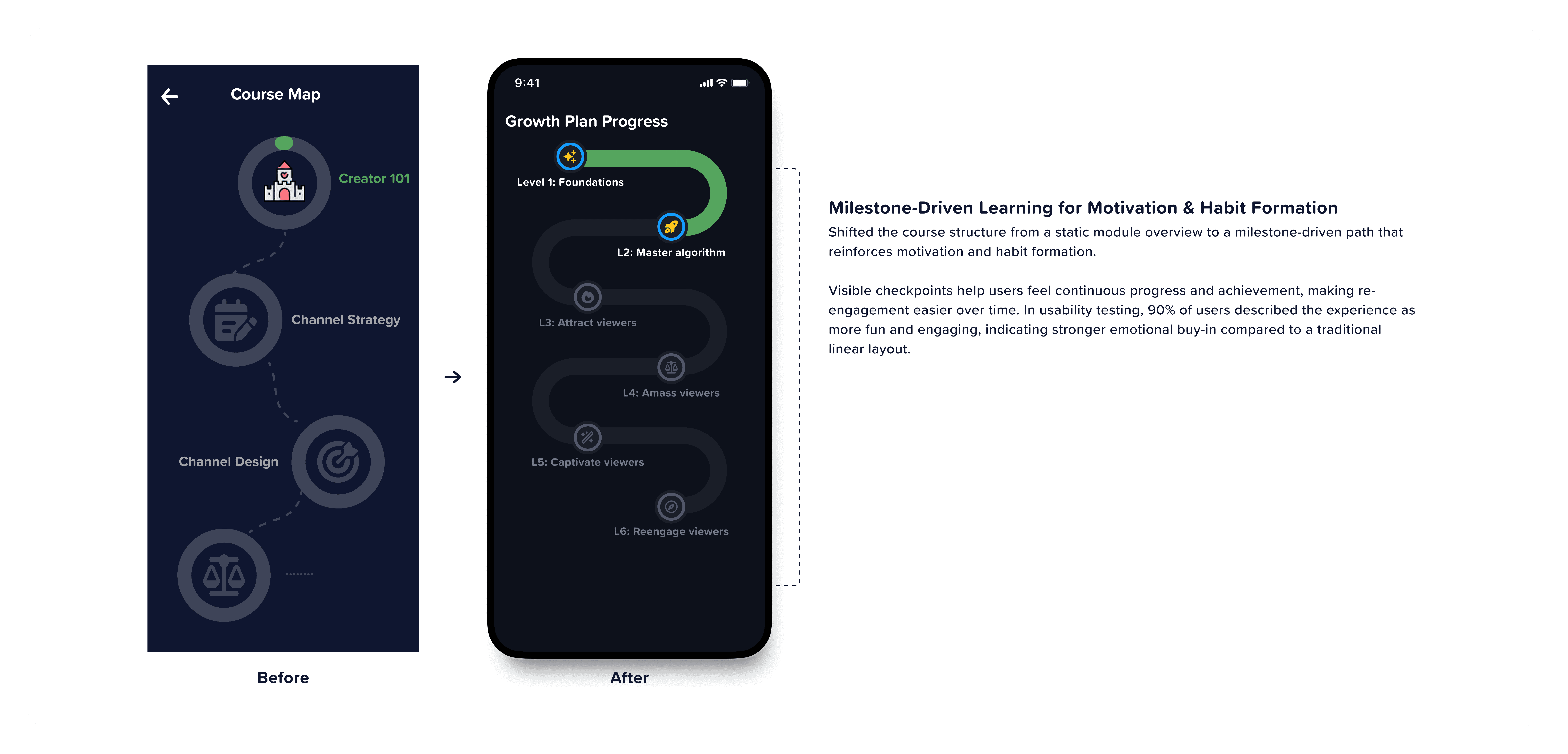 These insights directly informed the shift toward a task-first, coach-led experience with milestone-based progress, designed to build confidence and habit rather than requiring early data interpretation.