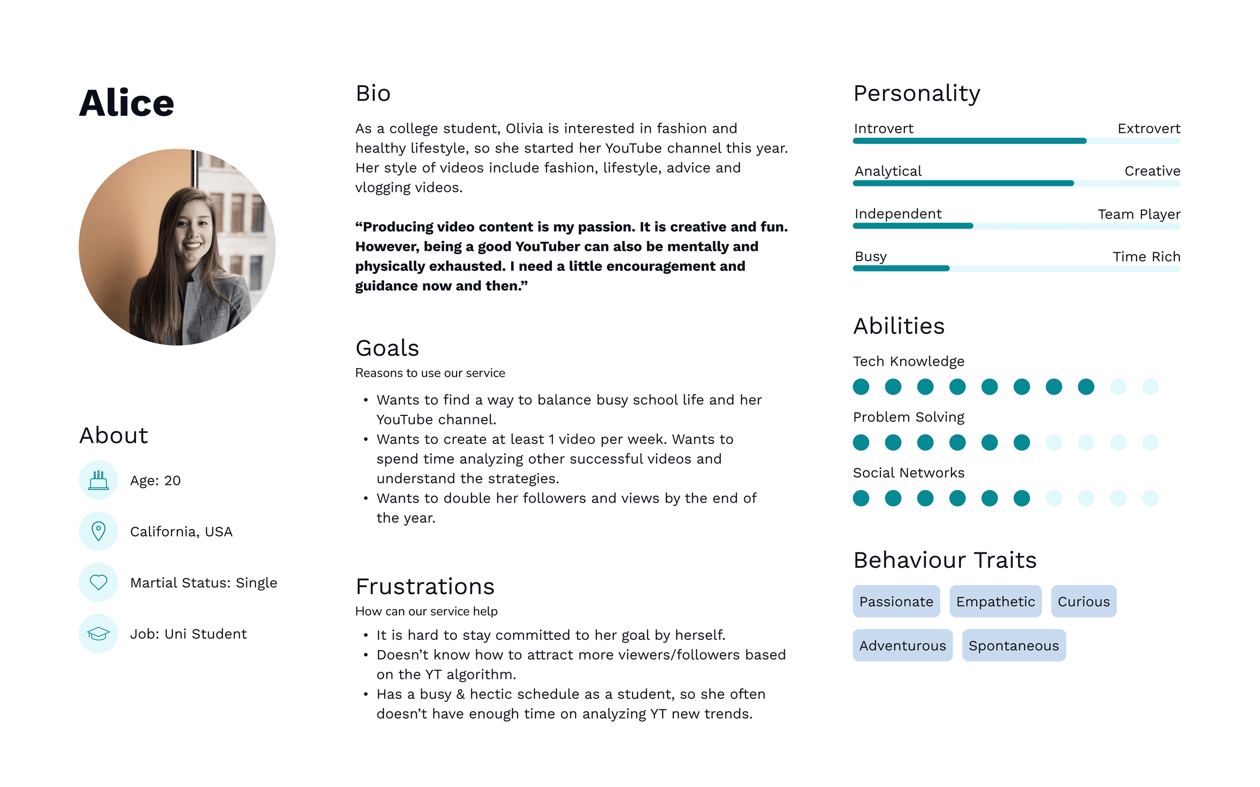 Using existing user research from the company, I created a user persona to clarify the goals and pain points of our target users, especially beginner YouTube creators who often feel overwhelmed. This helped guide design decisions and ensure the product met real user needs.